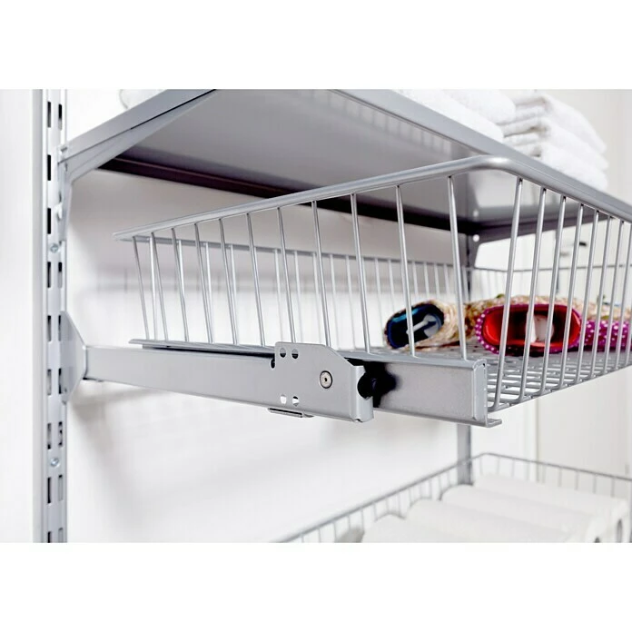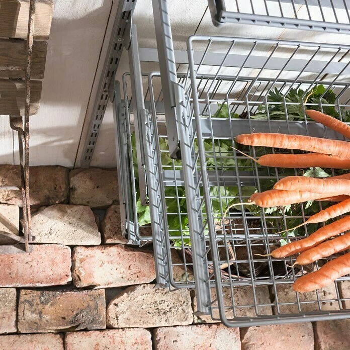 Der Drahtkorb mit Auszug von Element System eignet sich zur Kombination mit Lochschienensystemen und schafft Raum für alle Arten der Vorratshaltung. Die Montage erfolgt durch einfaches Einhängen und kann sowohl mit Schienen CLASSIC 50 als auch im CLASSIC 32 verbaut werden.