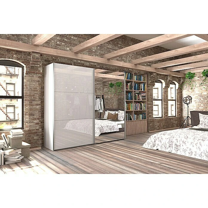 Der Kleiderschrank Swift von Express Möbel ist ein moderner Drehtürschrank, der in unterschiedlichen innen Ausstattungen, Dekoren, mit Spiegeln oder Glasfronten erhältlich ist. In den oberen Ablagefächern können Decken, Hüte oder Ähnliches sicher verstaut werden. Die Kleiderstangen eignen sich zur knitterfreien Aufbewahrung der Kleidungsstücke. Der aufgeteilte Innenbereich wird von den Türen verdeckt. Die Drehtüren mit alufarbenen Griffen und Dekorbeschichtung sind mit einer Soft-Close-Funktion ausgestattet, die für geräuscharmes und sanftes Schließen sorgt. Der Swift ist aus Holzwerkstoff gefertigt und verfügt über hochwertige Metallbeschläge. Er ist wiederaufbaubar und somit umzugstauglich.