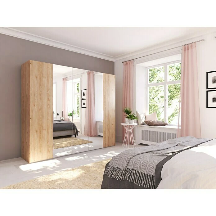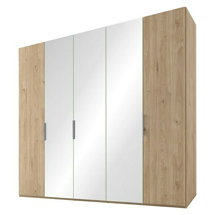 Der Kleiderschrank Swift von Express Möbel ist ein moderner Drehtürschrank mit Spiegel und einem frei zu nutzendem Innenraum. In den oberen Ablagefächern können Decken, Hüte oder Ähnliches sicher verstaut werden. Die Kleiderstangen eignen sich zur knitterfreien Aufbewahrung der Kleidungsstücke. Der aufgeteilte Innenbereich wird von den Türen verdeckt. Die Drehtüren mit alufarbenen Griffen und Dekorbeschichtung sind mit einer Soft-Close-Funktion ausgestattet, die für geräuscharmes und sanftes Schließen sorgt. Der Swift ist aus Holzwerkstoff gefertigt und verfügt über hochwertige Metallbeschläge. Er ist wiederaufbaubar und somit umzugstauglich.
