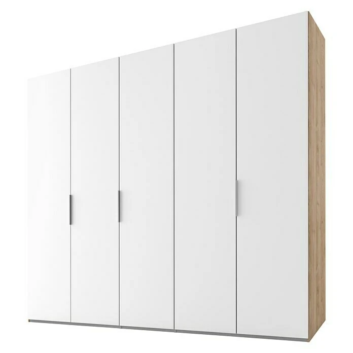 Der Kleiderschrank Swift von Express Möbel ist ein moderner Drehtürschrank mit einem frei zu nutzendem Innenraum. In den oberen Ablagefächern können Decken, Hüte oder Ähnliches sicher verstaut werden. Die Kleiderstangen eignen sich zur knitterfreien Aufbewahrung der Kleidungsstücke. Der aufgeteilte Innenbereich wird von den Türen verdeckt. Die Drehtüren mit alufarbenen Griffen und Dekorbeschichtung sind mit einer Soft-Close-Funktion ausgestattet, die für geräuscharmes und sanftes Schließen sorgt. Der Swift ist aus Holzwerkstoff gefertigt und verfügt über hochwertige Metallbeschläge. Er ist wiederaufbaubar und somit umzugstauglich.