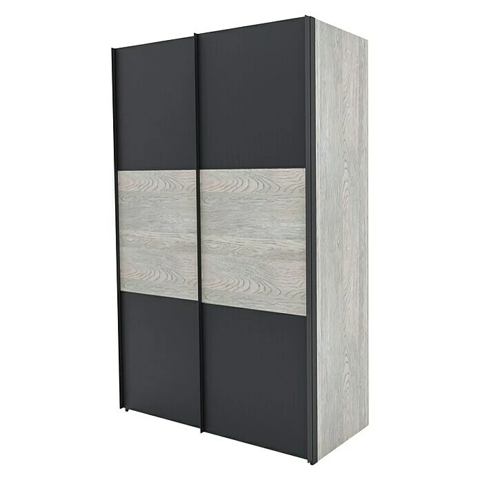 - Die Fronten des Schrankes sind in einer eleganten Kombination aus Graphit und Platin Eiche gehalten, während der Korpus in Platin Eiche gefertigt ist. Die Griffe in Graphitfarben runden das Design ab.