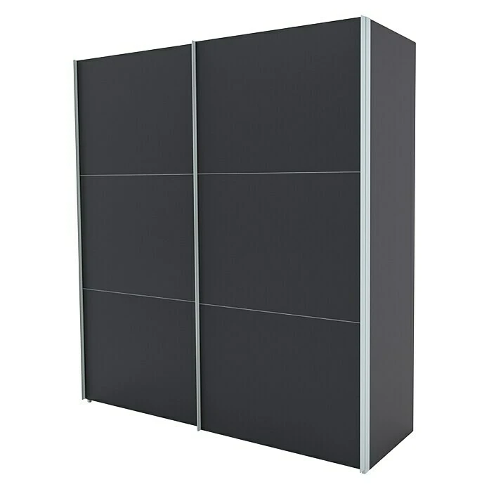 - Die Schwebetüren des Schrankes sorgen für eine elegante Optik und platzsparende Funktionalität. Die Front in Graphit und die Griffe in Aluminiumfarben verleihen dem Schrank ein zeitgemäßes Erscheinungsbild.