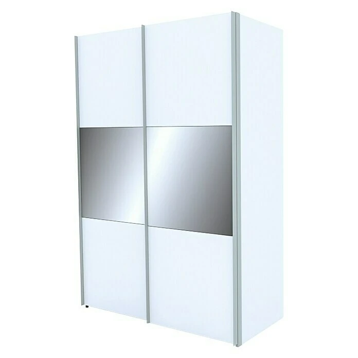 - Der Schrank verfügt über Schwebetüren in Weiß/Grauspiegel und einem Griff in Aluminiumfarben, was ihm ein elegantes und zeitgemäßes Aussehen verleiht.