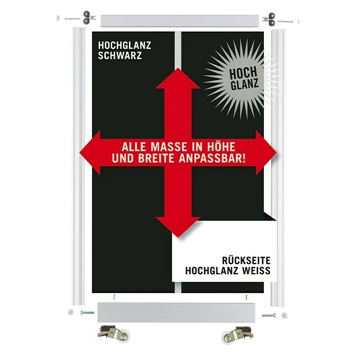 - Das BAUHAUS Room Plaza Easy Schiebetür-Bau-Set bietet eine elegante Lösung für moderne Wohnräume. Verfügbar in den Farben Hochglanz Schwarz und Hochglanz Weiß mit silbernen Profilen.