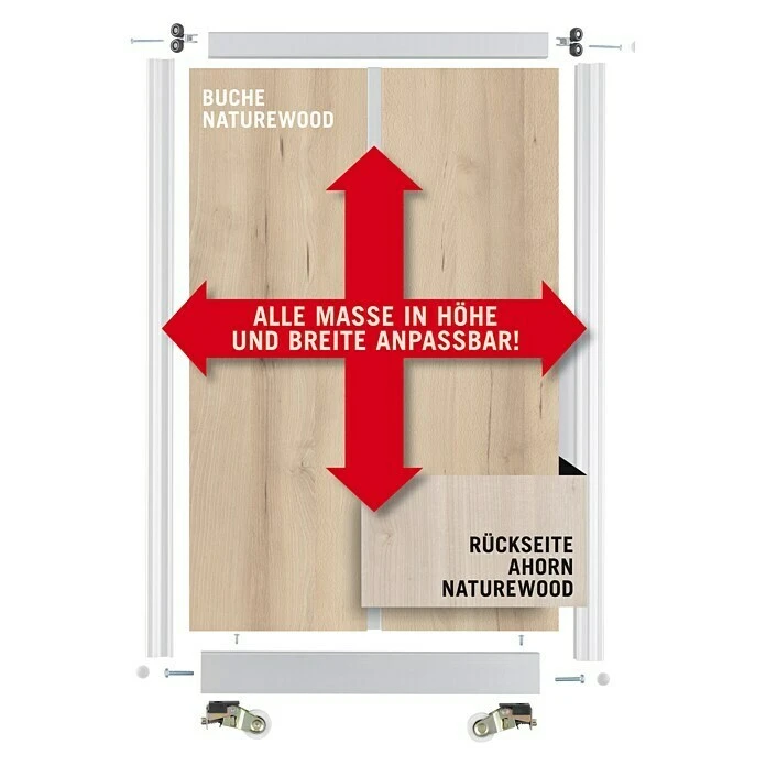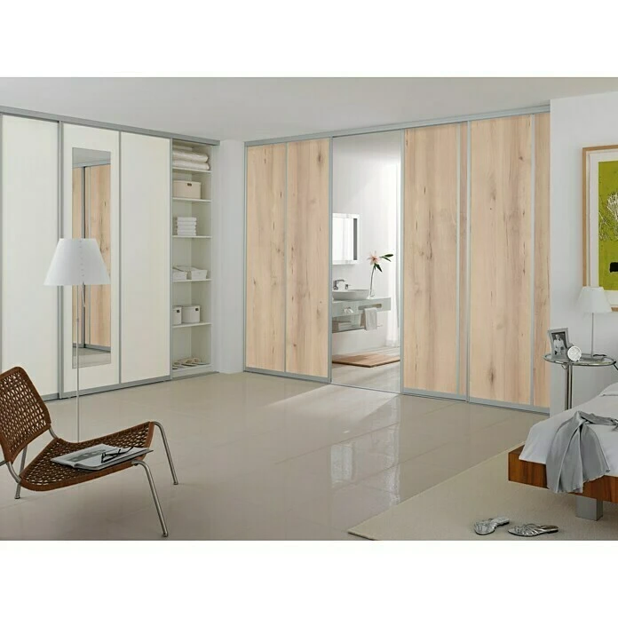 Mit dem Room Plaza Easy Schiebetür-Bau-Set lassen sich sowohl begehbare Schränke oder Raumteiler anfertigen, als auch Nischen und Ecken abtrennen. Die stabilen Alu-Schiebetüren in hochwertiger Verarbeitung lösen sogar schwierige Raumverhältnisse durch kostengünstigen Selbstbau. Dieses Schiebetürsystem beinhaltet zwei unterschiedliche Dekore – wahlweise Buche Naturwuchs oder Ahorn Naturwuchs. Das passende Room Plaza Easy Schienen-Bau-Set ist nicht im Lieferumfang enthalten und muss separat erworben werden. Auf Maß gefertigte Room Plaza Raum- und Ausbausysteme sind exklusiv im BAUHAUS Fachcentrum bestellbar.