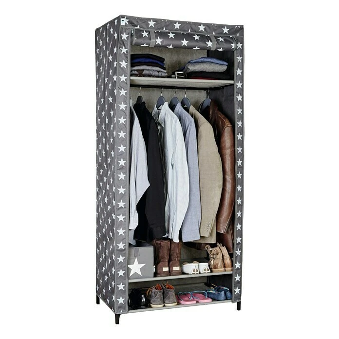 Der textile Kleiderschrank dient der staubfreien Aufbewahrung von Saisongarderobe oder als Gästekleiderschrank. Er verfügt über ein Wäscheablagefach, eine Kleiderstange sowie über zwei praktische Schuhböden. Durch zwei links und rechts angebrachte Reißverschlüsse lässt sich der Kleiderschrank einfach öffnen und schließen. Der Überzug des Kleiderschrankes besteht aus hochwertigem Polyester.